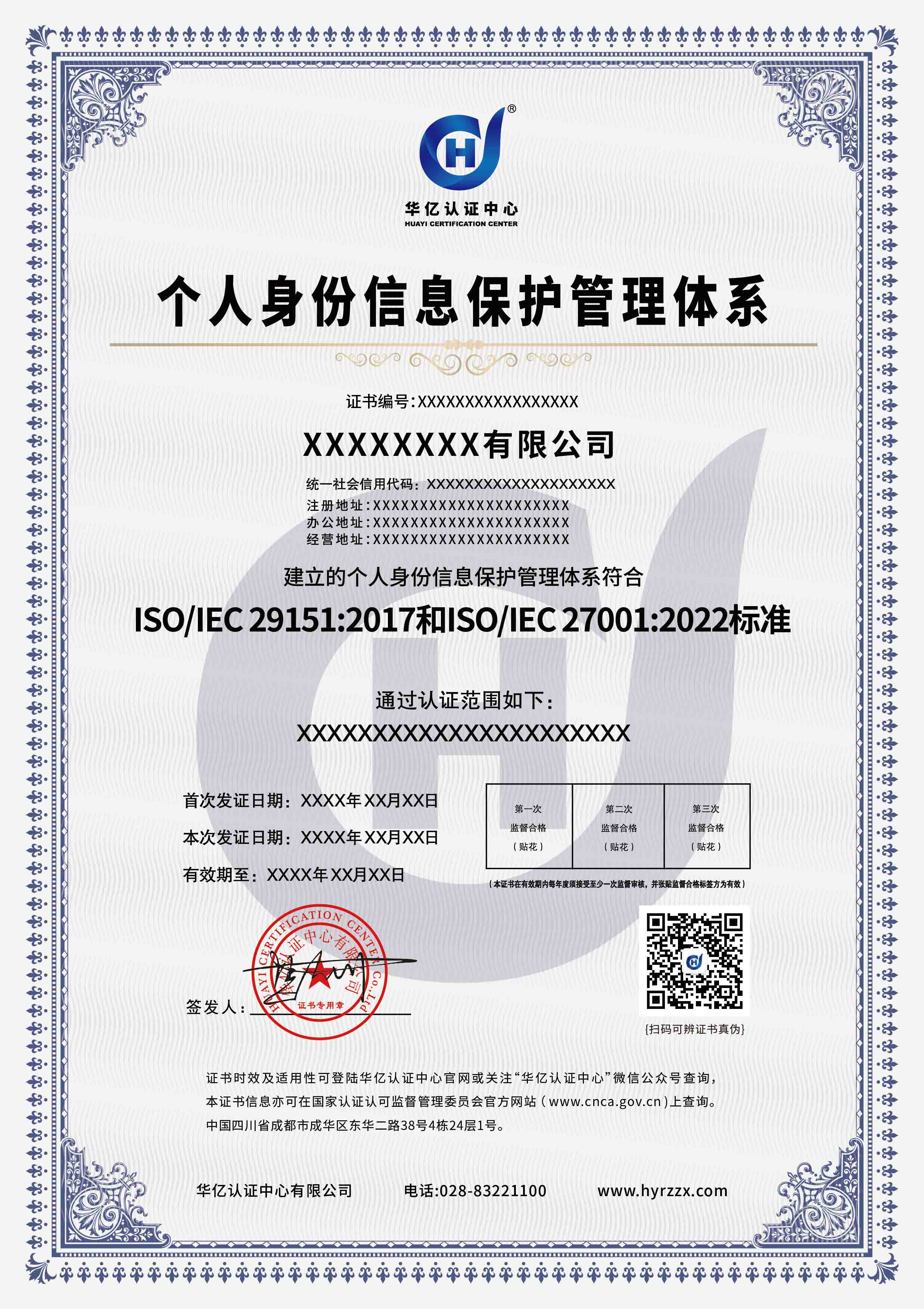 个人身份信息保护管理体系认证证书
